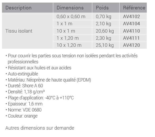 Tissu isolant 1000V néoprène VDE 0680, plusieurs format disponibles. En néoprène EPDM auto-extinguible, résistant aux huiles, acides et températures extrêmes. Épaisseur 1,6 mm, couleur orange sécurité. Idéal pour la protection des zones sous tension et les interventions électriques professionnelles.
